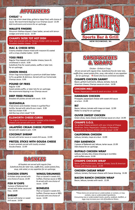 Champs' Menu highlights the various food options available for a quick bite before or after a big game. This sports menu is designed to be easy to read and features a wide selection of food to accommodate all fans' tastes.