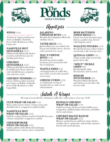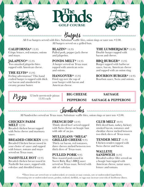 This menu for The Ponds is designed for a restaurant located on a golf course. The client requested a retro golf caddy design for their menu, reflecting the unique setting of their establishment and creating a visually appealing dining experience for their customers.